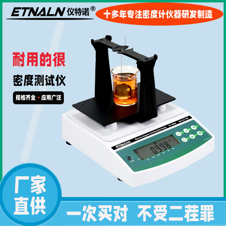 鹽水濃度與密度測(cè)定儀_鹽水電子密度計(jì)ET-01SC、ET-02SC是北京儀特諾公司根據(jù)阿基米德原理,采用德國(guó)進(jìn)口高精度測(cè)量傳感器,依據(jù)GB/T1266-2006、GB 1253-2007標(biāo)準(zhǔn)規(guī)范,先測(cè)得密度值,然后由密度值自動(dòng)計(jì)算出鹽水濃度值%、波美度Be;測(cè)量精準(zhǔn)、簡(jiǎn)便快速、可靠性高等特點(diǎn)。