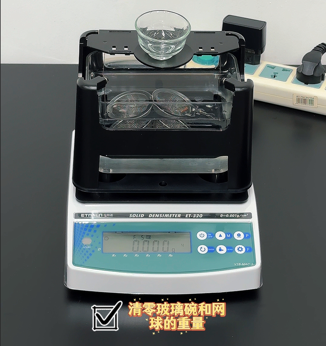 1、測量臺將網(wǎng)球置于水中的吊籃上,玻璃杯置于測量臺上,按【zero】鍵清零