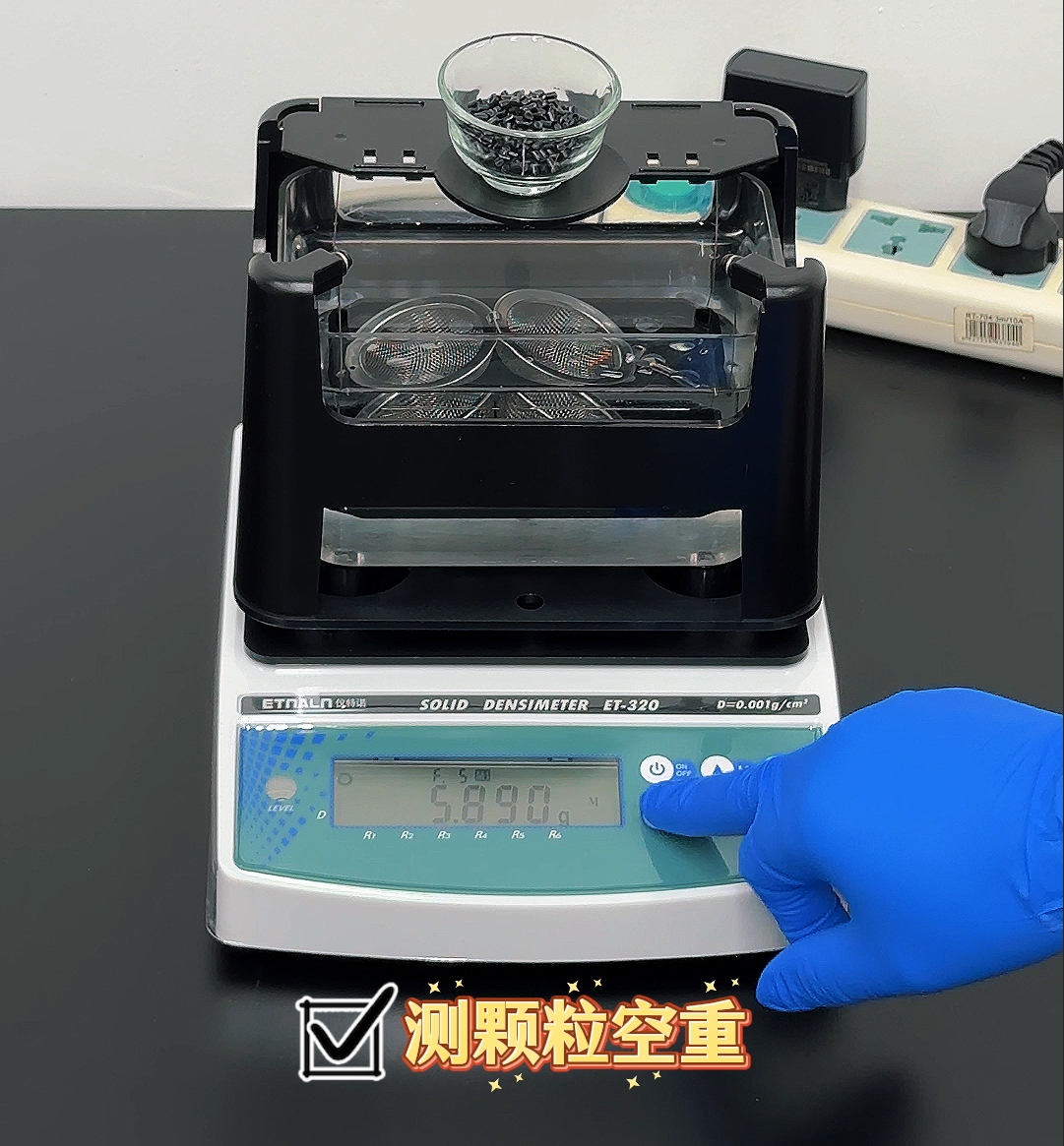 因為單個顆粒太輕,我們沒法只取一顆來測試,所以需要配套使用玻璃碗和網(wǎng)球(儀器標準配置里都有含有測顆粒的配件、測浮體配件)。