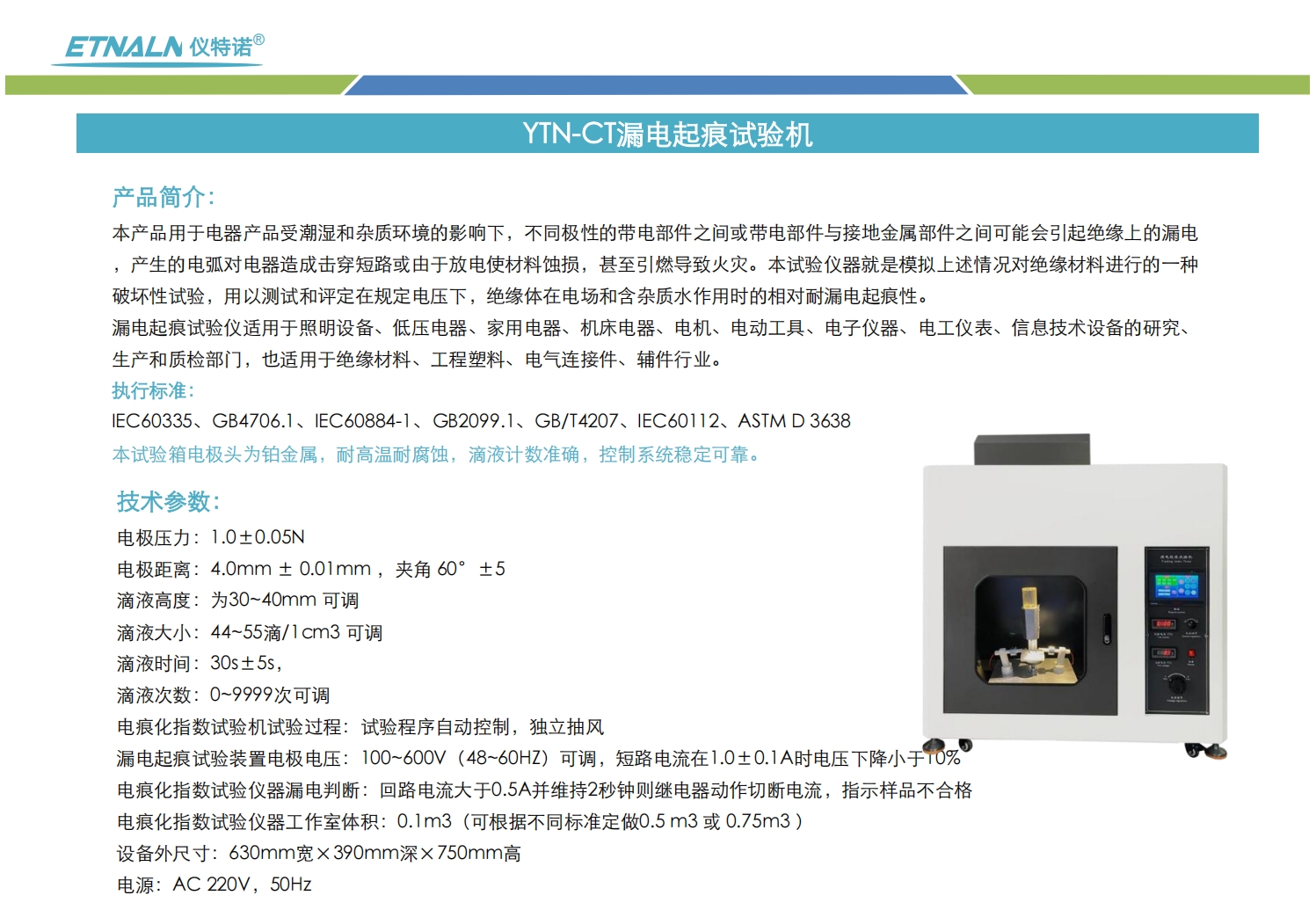 該設(shè)備用于評估材料在潮濕環(huán)境下的耐電弧性能,測定CTI和PTI指數(shù)。電極需選用鉑金材質(zhì),銅電極測試結(jié)果不被認可,需在報告中明確標注。